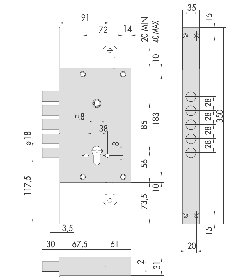 Чотирихригельний циліндровий замок з реверсивною клямкою cisa 56.535B (56.505B) з можливістю підключення розпірних тяг-додаткових точок замикання.