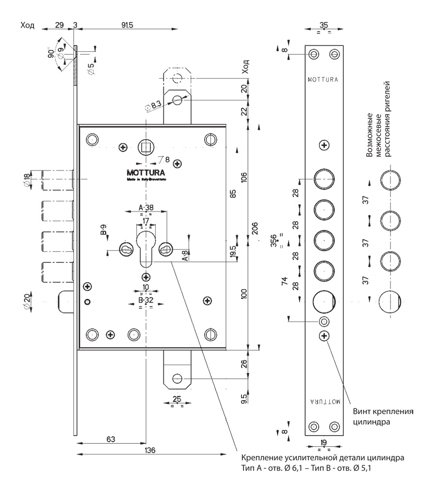 Ціна: 2890 грн. замовитиТипорозмір врізного замка Mottura 85971 є одним із найпоширеніших стандартів щодо встановлення та розмірних характеристик. Використання євроциліндра в циліндрових замках забезпечує замкам переваги, якими має сам циліндровий механізм: ключі з контролем виготовлення дублікатів; можливість створення майстер-систем; набагато вища секретність щодо сувальдних замків. У внутрішньому механізмі замка Mottura 85971 є запатентовані деталі, які відрізняють його від решти циліндрових замків. Замок має захист проти вбивання ригелів усередину корпусу замка. Також у врізному замку Mottura 85971 вбудований механізм безповоротного блокування ригелів при вибиванні циліндра. Є можливість закривання у 3 сторони. Ригельна система висувається на 40 мм, тяги на 20 мм. Діаметр ригеля 18 мм. Рекомендується встановлення марганцевої пластини для замку та броненакладки для циліндрового механізму. Установка циліндра відбувається через торцеву планку (типовий спосіб кріплення), або кріпленням типу Mottura. Гарантія заводу виробника 24 місяці. Виробництво Італія.